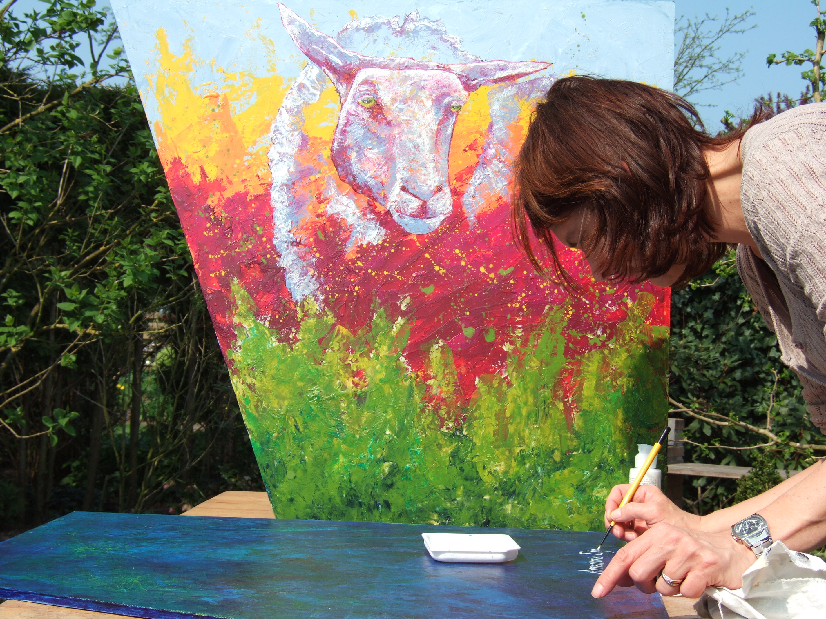 8 april 2009Na nog wat wilde verfstreken, na wat detaillering in de koppen heb ik besloten het hierbij te laten. Ik stuur een paar eigenzinnige schapen naar Terschelling. Nu nog aflakken, inpakken een goede pakkende begeleidende tekst schrijven en dan ben ik ruim op tijd. Heerlijk weer wat ruimte voor andere werken die al tijden smachtend tegen de muur staan om nou eindelijk eens te worden voltooid!