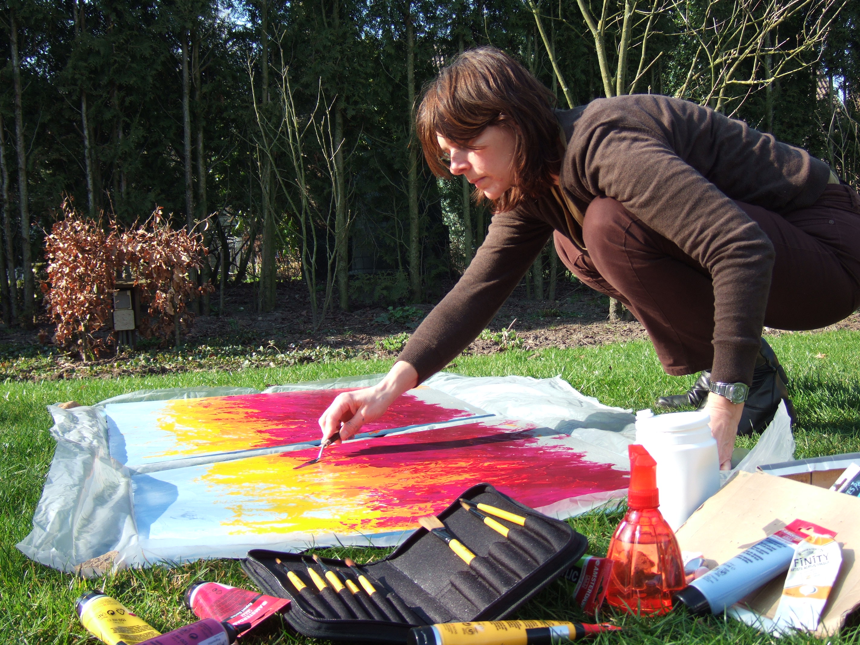 21 maart 2009In verschilldende sessies aan de slag gegaan met de voorkant van de "windnomade". Met de term "kleur bekennen" in het hoofd moeten daarbij natuurlijk wel heldere en felle kleuren gehanteerd worden.