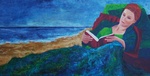 2009Dame liggend op het strand verdiept in een boek.